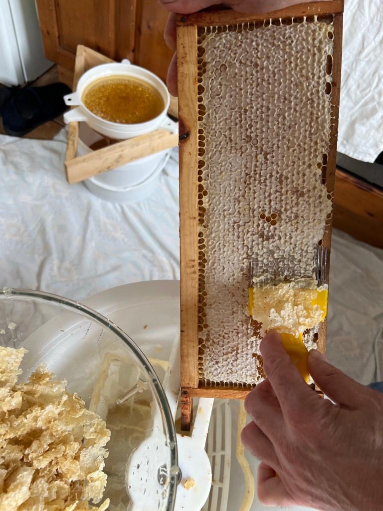 We start by uncapping the honey. This is essentially a many pronged fork. The cappings are saved for later.